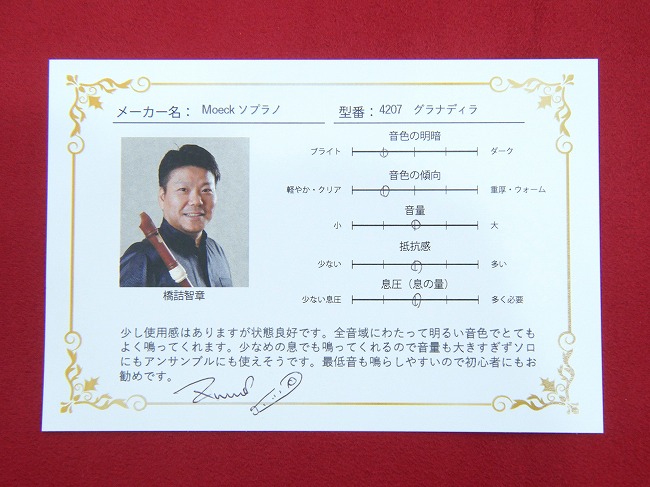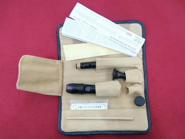 吹き口の部分に少し褪色が見られますが、丁寧に使用されていたことが伺えます。サムホールのエッジも綺麗に残っています。グラナディラ材ですが、この個体は全く「押し付けがましくない音」を奏でてくれます。そしてとにかく最低音の発音が素晴らしい!初級?中級者の方にとっての悩みどころである、音の出しにくさや音域による息のコントロールの難しさといったストレスが、この楽器を使うことによってかなり解消されることでしょう!おすすめです。