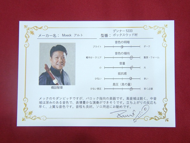 メックの高級機種、デンナーモデルです。他の大多数のリコーダーとは一線を画する、憂いを帯びた深みのある音色は、この楽器の最大の魅力でしょう。たった1音、ロングトーンを吹くだけで、心はもうバロック時代に飛び立てます(モダンピッチですのでご安心ください)。もちろん古い時代の曲だけでなく、マイナーキーのバラードなどで使用すると、とても渋い演奏になると思います。息を入れた時の抵抗感がしっかりあり「もっと吹きこんでも大丈夫」と楽器が語りかけてくるような器の大きい個体です。抜群に吹き心地のよい1本です!