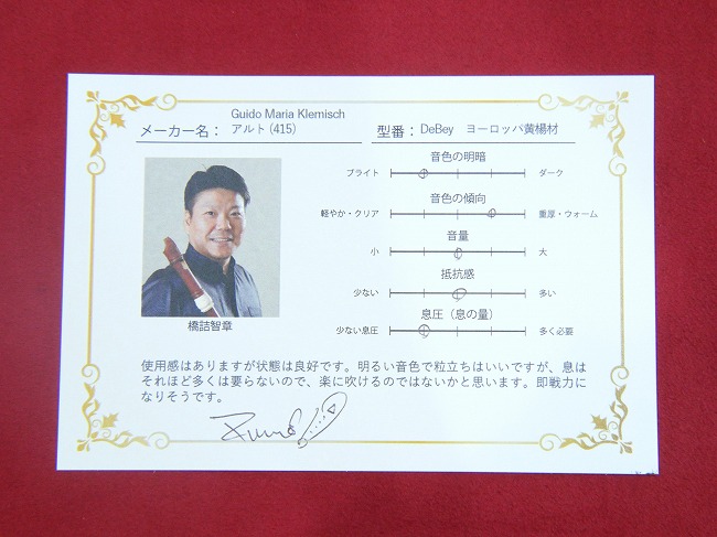415Hzというだけでも落ち着いた響きを感じさせますが、この楽器はそれに加えて、細部に至るまで丹念に仕上げられていることが音からも伝わってきます。少し抽象的な表現になりますが、まるで「高い品性と深い知識を備えた人の語り」のような印象を受けます。吹き手のさまざまな要求や感情を受け止めつつも、決して取り乱したり感情的になったりせず、常に音として理知的な答えを返してくれる──そんな楽器です。この楽器を手にすれば、きっと良い演奏となって応えてくれることでしょう。