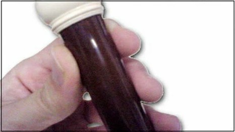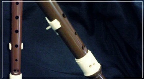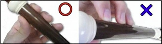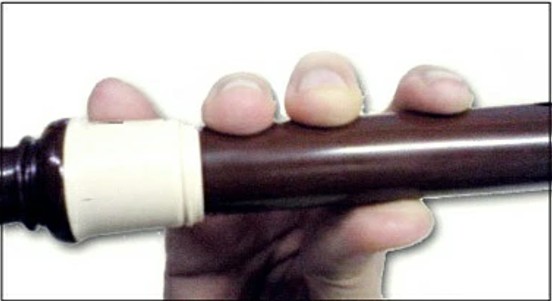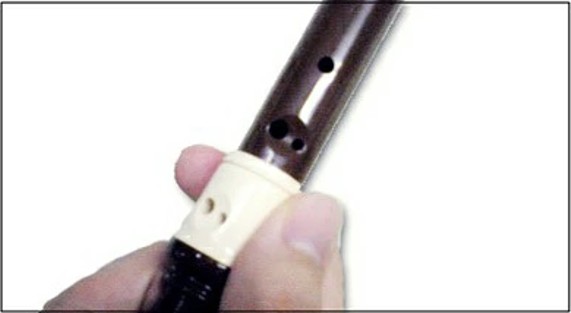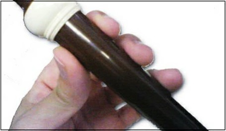 入門者にとって指掛けは楽器を支えるのに非常に大きな助けとなります。上の写真はわかりやすいように白い指掛けを使用しておりますが、基本付属で付いてくるものに関しては、本体と同系色になりますのでそんなに目立ちません。 木製リコーダーは本体に親指を置きやすいように細工されているものもございます。