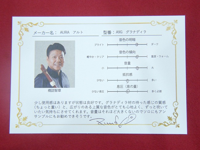 見た目の使用感はありますが、とてもいい楽器です。とにかく音が良い!グラナディラ材特有の、密度の詰まった良質の音を持っています。低音から中音にかけての音のつながりが良く、「吹けば吹くほど音が鳴る」ような錯覚に、つい陥ってしまいそうになります。