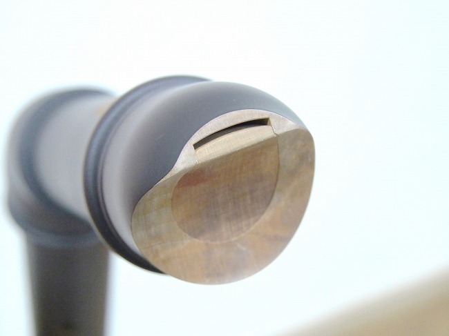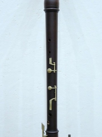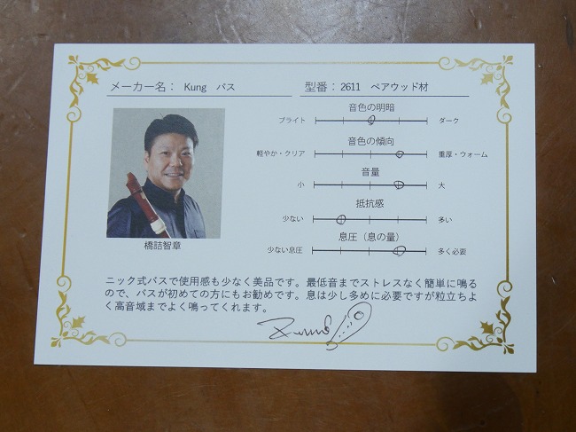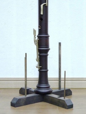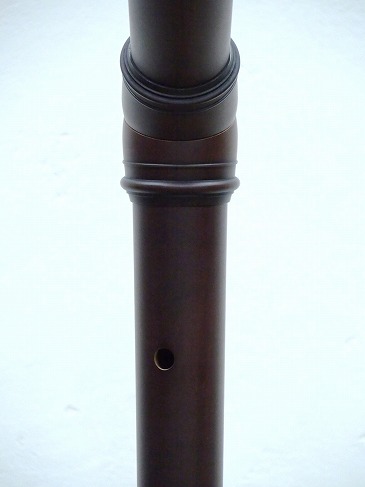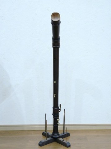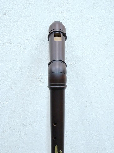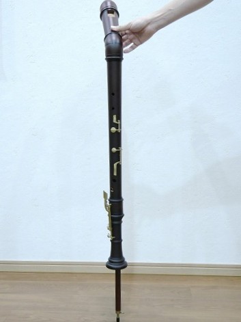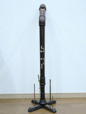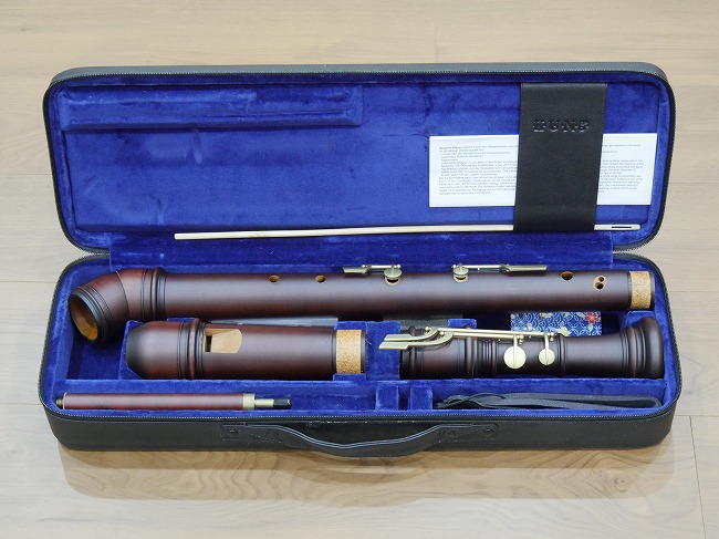 普段ではリコーダーフェアくらいでしかお目にかかることのできない、キュングのニック式バスリコーダーが「笛吹の館」に登場です!キュングの細部へのこだわりとでも言いましょうか、ムラのない、どこまでも滑らかな艶消しステイン仕上げの管体に合わせて完璧にコーディネートされた、艶消し仕上げで落ち着いた金色のキーも相まって、どこからどうみても美しく、惚れ惚れしてしまいます。重量は約1047gと重ためですが、ストラップや付属の演奏用スタンドを使用することで指への負担を軽減してくれます。最低音時のキーもとても押さえ易く、何より「低音がちゃんと出るかなー?」という心配を一切することなく、安心して発音することができます。低音の音量がとても大きいので低音好きの方は気に入ってくれると思います。バスリコーダーの最低音から中音域にかけてはアンサンブルにおける生命線です。この個体でストレスなく、アンサンブルを楽しみましょう!